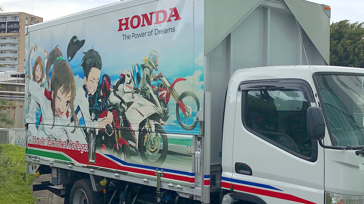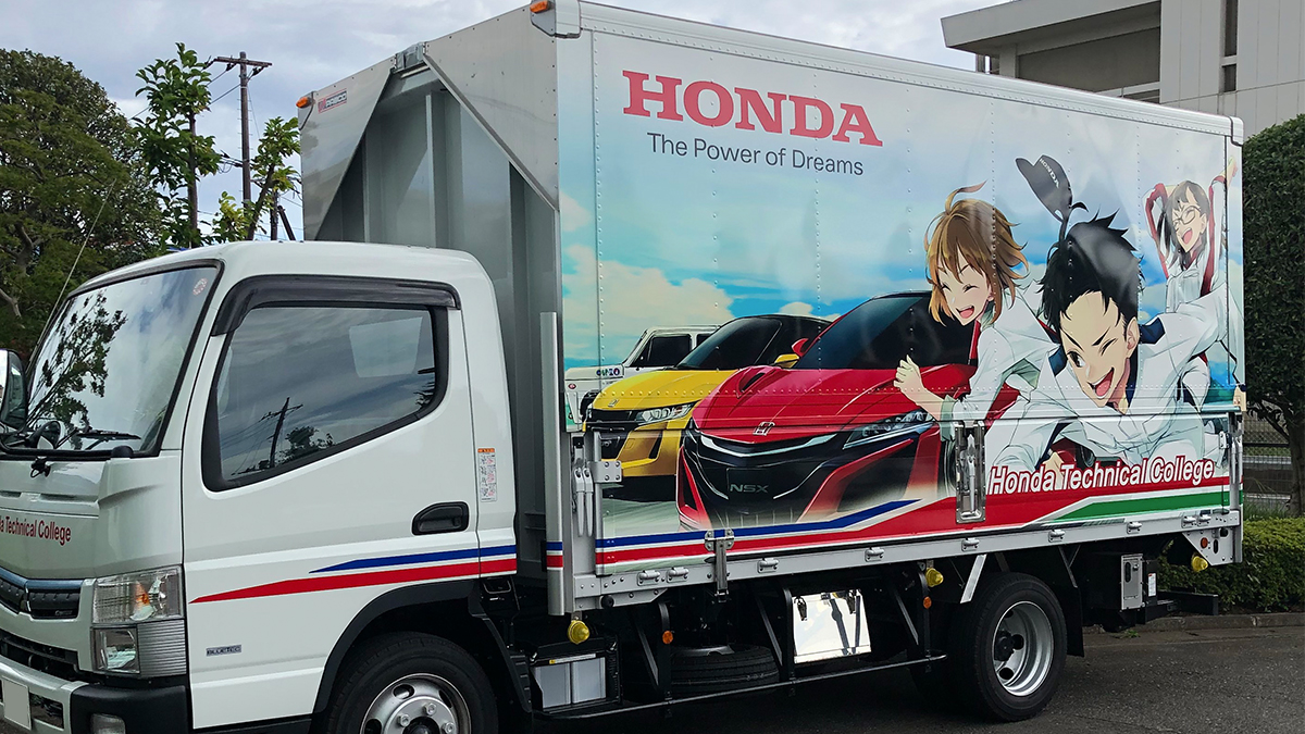 また、イラストはホンダ学園生がクルマ・バイクとともに疾走する流麗なデザインで、当校の学生・教職員からも好評です。