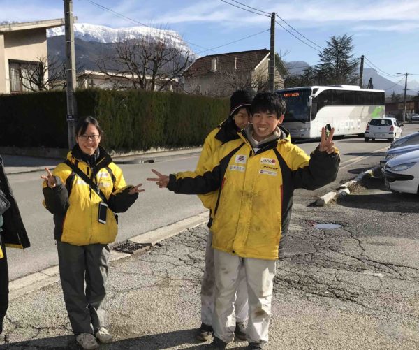 - 2日目、雪でレース中止の区間が発生するなど、例年にない予想外のレースとなった。そのような環境でも、学生はサービスポイントでの作業に余念はありません。