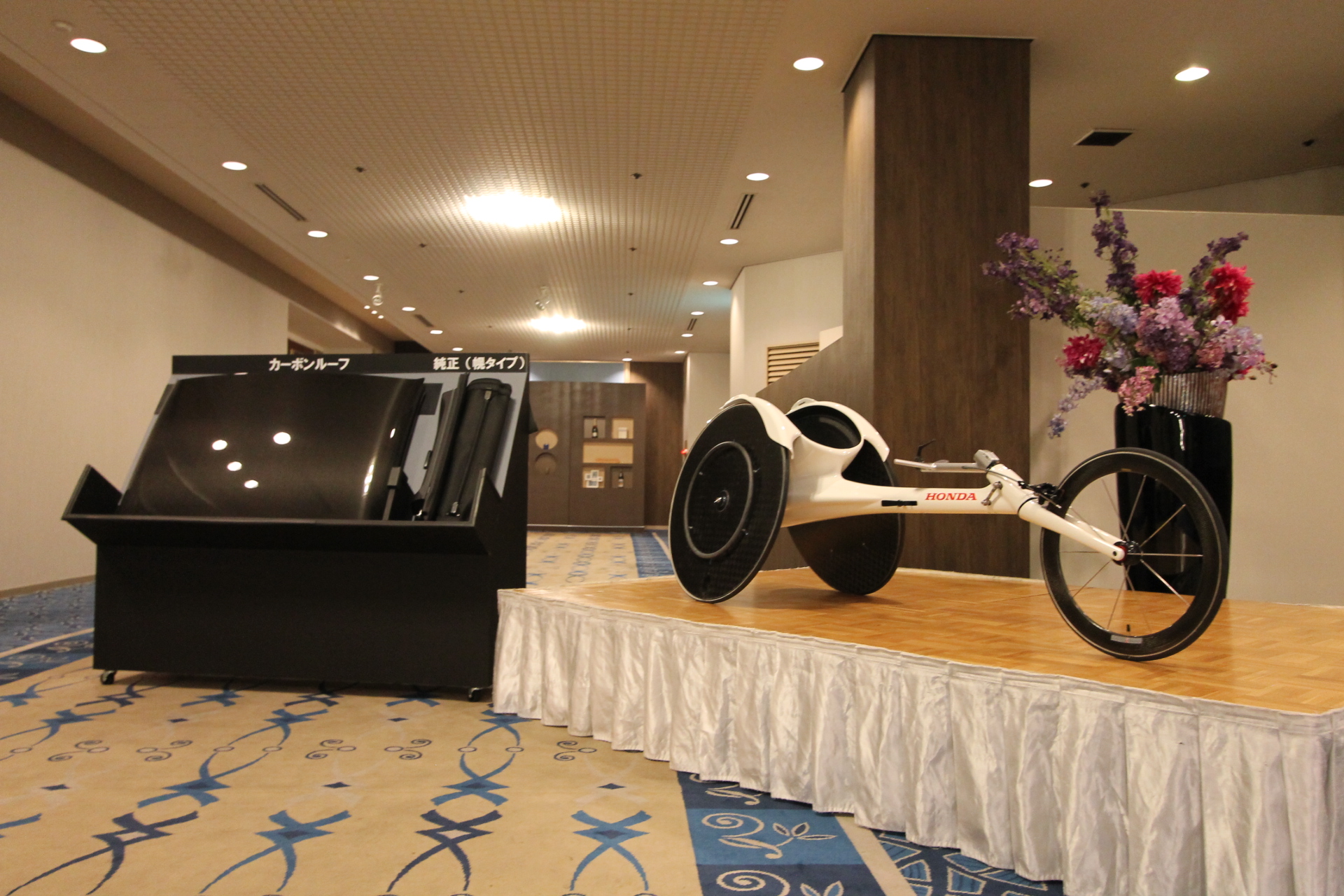 総会会場入り口に展示した講演テーマの「陸上競技用車いす」