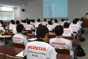 今回のテーマは『創業者が語る Hondaの原点』で、本田宗一郎さんや藤沢武夫さんの実際の言葉や映像を通してわかり易く、楽しい講話となりました。参加した学生は、HondaのDNAを理解し、明日からの授業や将来の目標に向けて行動するきっかけになる貴重な1日となりました。