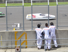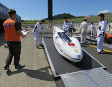 このマシンは、昨年から新エンジンと規定の燃料噴射装置を導入したマシンで、一級自動車整備研究科の学生が全く先生の手を借りず、こつこつと作り上げました。昨年のもてぎ大会では、燃費ではダントツの優勝だったのですが、ドライバーとピットサインの意思疎通がうまくいかず、週回数オーバーで記録なしとなってしまいました。