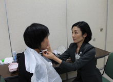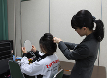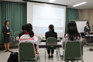 いつも使っている自分のメイク道具で参加者全員で実際にメイクを行いました。参加した女子学生は鏡をみながら一生懸命メイクに挑戦していました。それぞれのメイクについてアドバイスをもらい、最後はヘアアレンジも実際に施してもらい、ヘアメイクが完成!素敵な女性に変身しました。参加した女子学生の皆さんは、今まで以上に自信をつけ教室をあとにしました。これで第一印象バッチリですね。