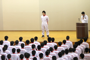 4/21には武井さんを応援する合同朝礼が開催され「本日は貴重なお時間を頂きありがとうございました。皆さんの期待に応えられるよう、精一杯がんばります。応援宜しくお願いします」と集まった学生に伝えました。日曜日には応援する学生を乗せたバスがもてぎに出発します。