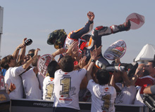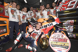 タイトルに王手をかけた Repsol Honda Team のマルク・マルケス選手が、Hondaのホームグランプリで見事にタイトルを獲得すると、学生の皆さんとガッツポーズで喜びました。
