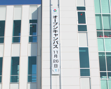 寄贈式終了後、寄付をいただいた、「懸垂幕」を正面玄関の真正面の一番目立つ壁面に、設置をさせていただきました。「懸垂幕」の内容は、“オープンキャンパス開催日”のご案内です。透き通った青い空に真っ白な懸垂幕は大変気持ちの良いもので、今後たくさんの高校生の皆さんのお出迎えをしてくれる事でしょう。Honda Cars 野田の岡村社長様ありがとうございました。