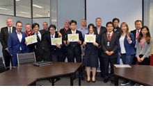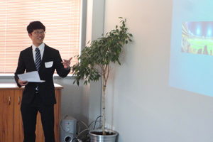 NZ組 発表の様子- 12月2日、6日の2日間、ニュージーランド(NZ)のオークランド、オーストラリア(AU)のメルボルンにおいて、3月から現地で研修を行っていた国際自動車整備科2年生6名(NZ:2名/AU:4名)の研修報告会が行われました。この報告会は、9ヶ月間の研修で学んだ様々な事柄について、お世話になった現地の方々の前で英語で発表を行うもので、研修の総括イベントとして毎年行われています。