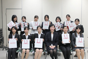 今年度は化粧品メーカーの資生堂様から講師をお招きし、就職活動や社会人として必要な、基本的なスキンケアや第一印象を良くするメーキャップや身だしなみの方法を教えてもらいました。