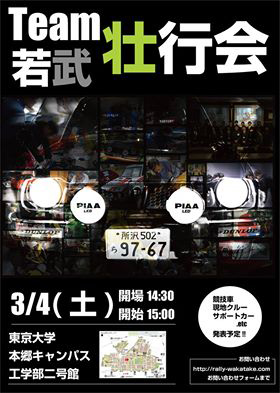 3月4日(土)東京大学 本郷キャンパス 工学部二号館にプロジェクトメンバーと関係者の皆さんが集い壮行会が行なわれ、ドライバー・コドライバーより今回のラリーに対する豊富や車両に関するコメントを頂くことが出来ました。
