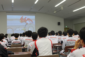 最先端技術を駆使した「カーボンレーサー」やカーボンとアルミをもちいた「ハイブリッドレーサー」など、競技用車いすの開発裏話を特別に披露していただきました。また体育館ではレーサー仕様の車いすを体験できるなど、モノづくりの技術者を目指す学生に、貴重な体験をさせていただきました。