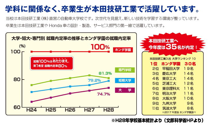 - 将来のHondaを担うエンジニアを育成する為、また幅広く自動車業界で活躍するエンジニアを育成する為、2018年4月より新設される、企業ニーズを反映した4年制の新しい学科です。まず最初の2年間(1-2年次)に二級自動車整備士資格を目指して学びます。そして3-4年次からの選択コースでさらに専門性を高めていきます。選択コースにはホンダ学園独自のカリキュラムもあります。