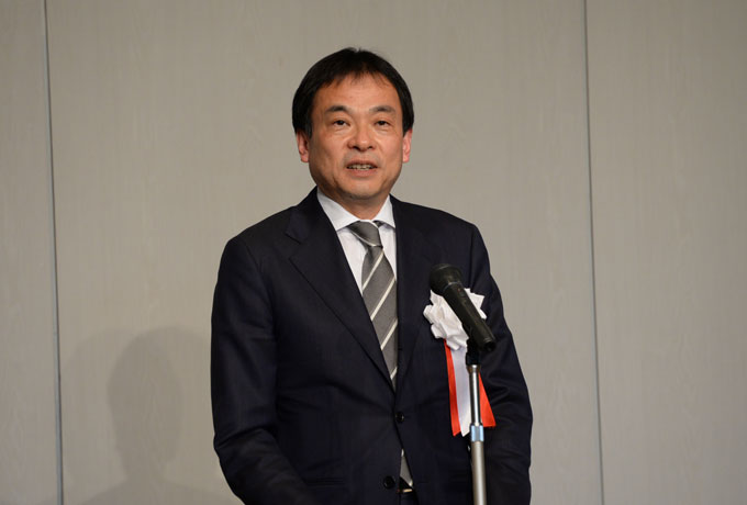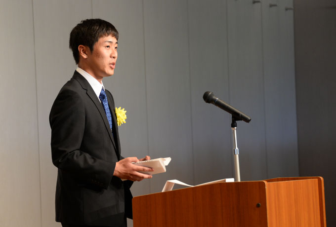 在校生代表挨拶。新しい仲間にお祝いの言葉を伝えました。