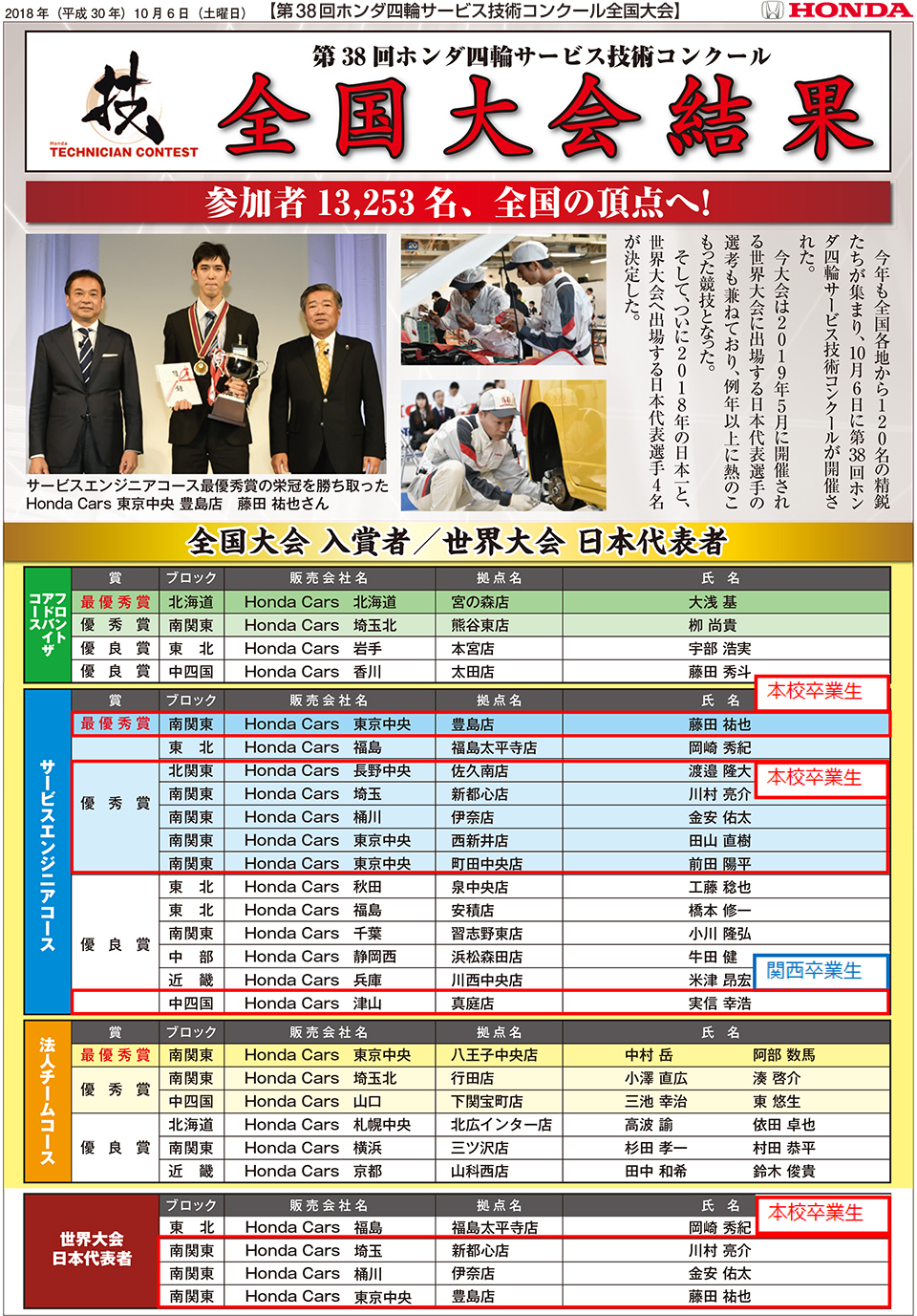 今大会では、ホンダテクニカルカレッジ卒業生が大活躍をし、サービスエンジニアコースの最優秀賞には本校卒業生の「Honda Cars 東京中央:藤田 裕也様」、優秀賞には5名、優良賞には1名の卒業生が入賞しました。また、世界大会に出場する日本代表4名の中に、ホンダテクニカルカレッジ関東卒業生がなんと3名。