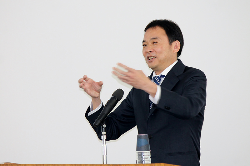 学生を前に熱心に講話する寺谷執行役員
