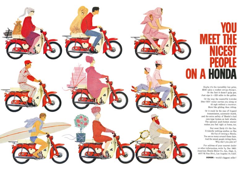 入荷したスーパーカブは、1963年に米国で広告展開された「ナイセスト・ピープル・キャンペーン」に描かれたイラストをモチーフとした、マグナレッドのボディーカラー。また、ツートーンシートやブラック塗装のリアキャリアを採用。更に60周年記念の特別エンブレムとキーを採用した特別限定車です。
