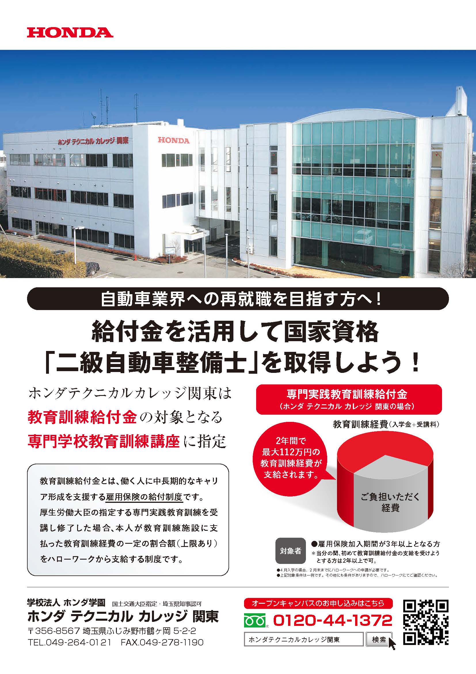 ホンダテクニカルカレッジ関東校のサービスエンジニア学科(2年課程)は、厚生労働省より教育訓練給付金の対象となる「専門実践教育給付金指定講座」に再認定されました。社会人の方・社会人だった方の学び直しに、国(ハローワーク)が支援してくれる制度です。自動車業界で活躍してみたい方は、ぜひこの制度を利用してホンダ学園で二級自動車整備士資格を取得しませんか。