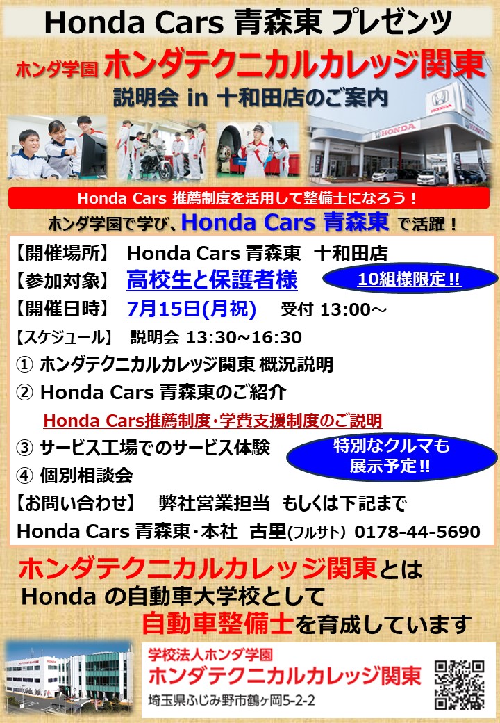 7月15日(月)祝にホンダカーズ青森東・十和田店様にて、説明会とサービス体験を行います!
