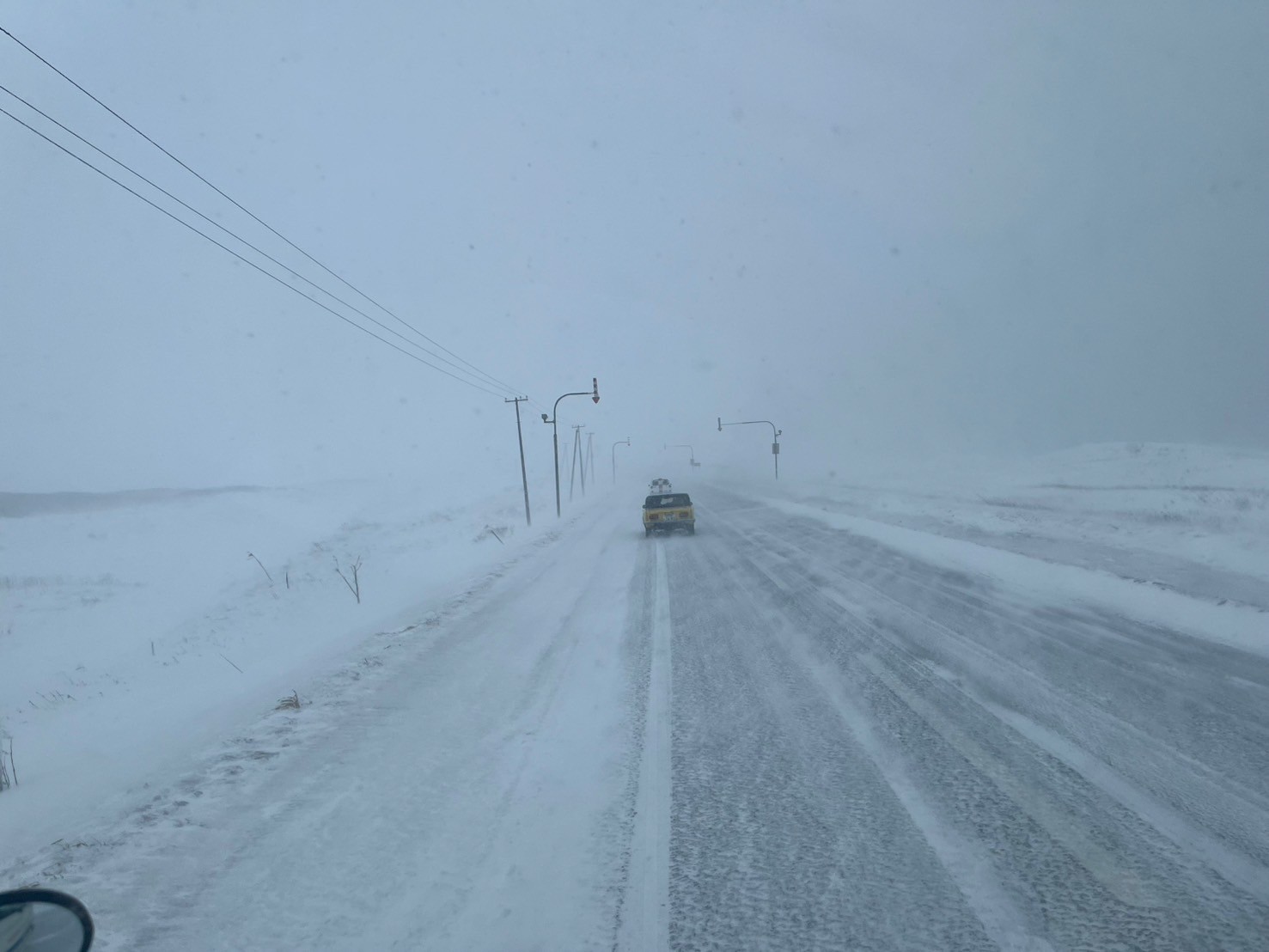 猛吹雪で舞い上がる雪の中では、前は霧の中の様で道路のどこを走れば良いかわからなくなり、