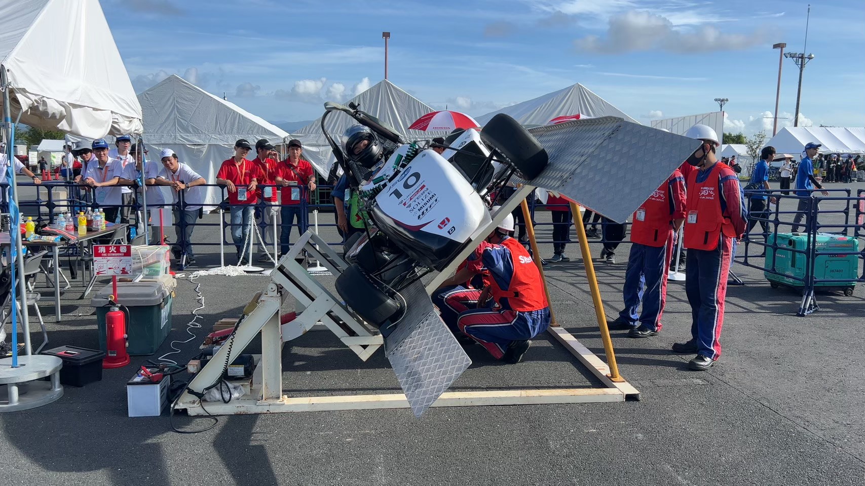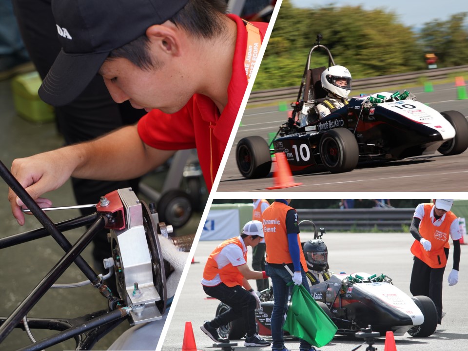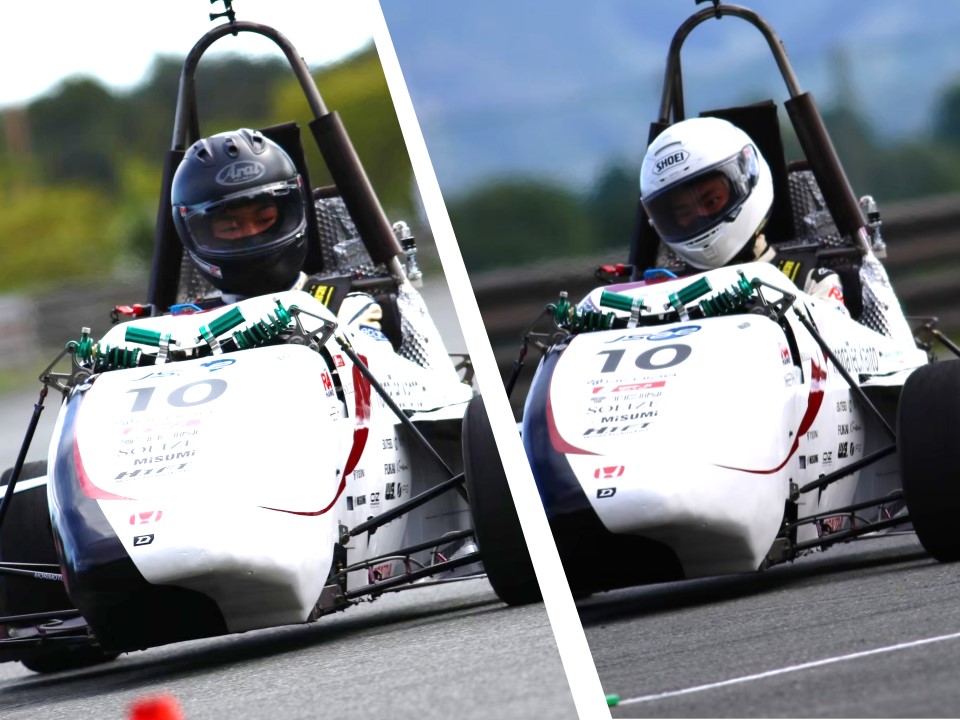 大会においては事前審査の結果により車検順番が遅れる事となり、動的競技への出場が危ぶまれる状況でしたが、OBによる模擬車検による指摘を元にマシンを修正し当日を迎え、短時間での合格を達成しました。