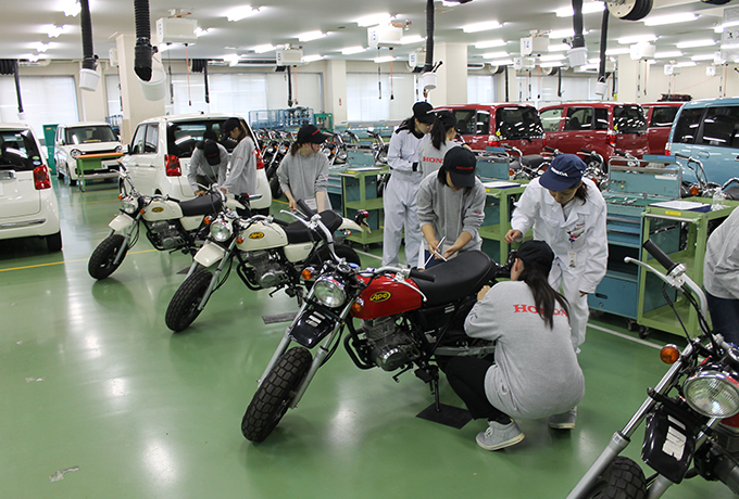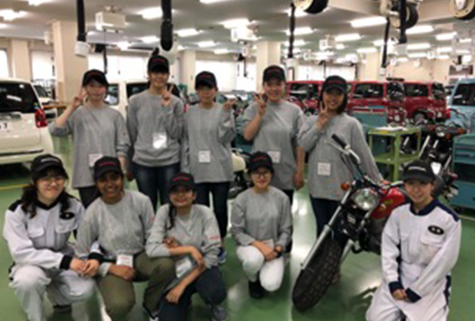 午前中はHondaのバイク”Ape“のメンテナンス体験。エンジン始動体験、シートやマフラーの取り外しなどを行い、エンジンの仕組みを学んでもらいました。午後は場所を移してカート体験。ほとんどの参加者が初めての運転ということでドキドキしている様子でしたが、終わる頃には笑顔いっぱいで楽しんで頂けたようです。今後も楽しいイベントを企画しますので、クルマ・バイクに興味のある女子学生の皆さんのご参加お待ちしております!