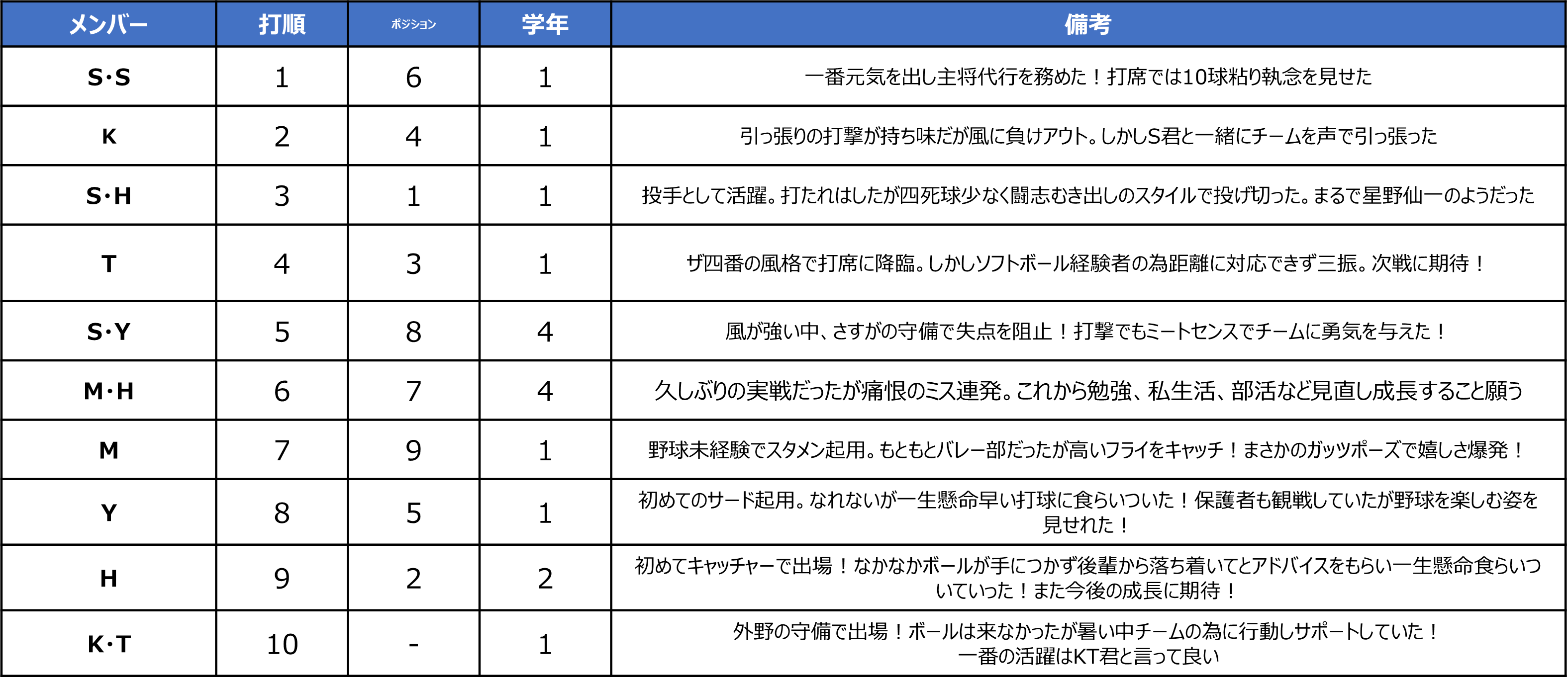 今回は10名参加 そのうち7名が1年生という新入生が非常にがんばった試合でした