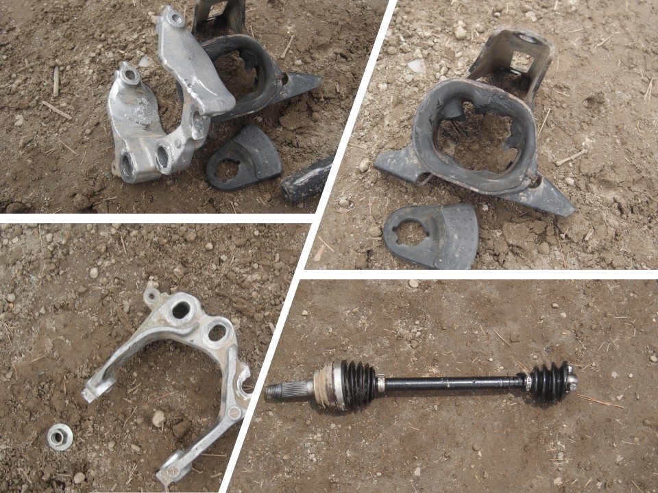 - オフィシャルカーに牽引されて戻ってきた車両を確認したところ、ミッションマウントの破損、ドライブシャフトの破損、ミッションケースに穴開き、それに伴いオイル漏れを確認。