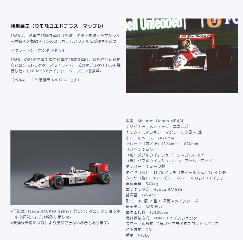 本田技研工業からは、伝説のF1マシン「マクラーレン・ホンダ MP4/4」