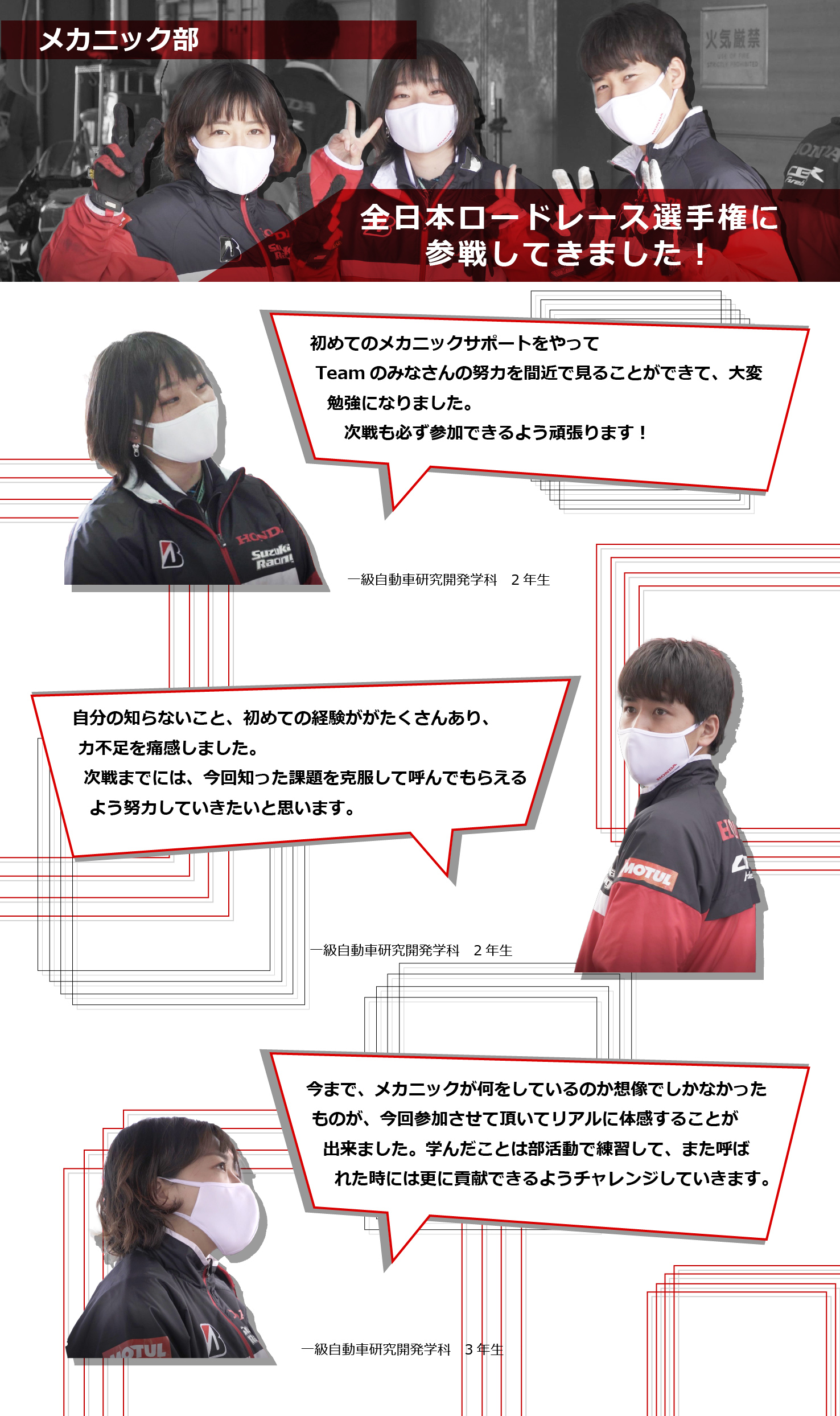 - メカニック部が、全日本ロードレース選手権にエントリーしている『Honda Suzuka Racing Team』様のメカニックサポートとして、4月3日からの開幕戦に帯同。