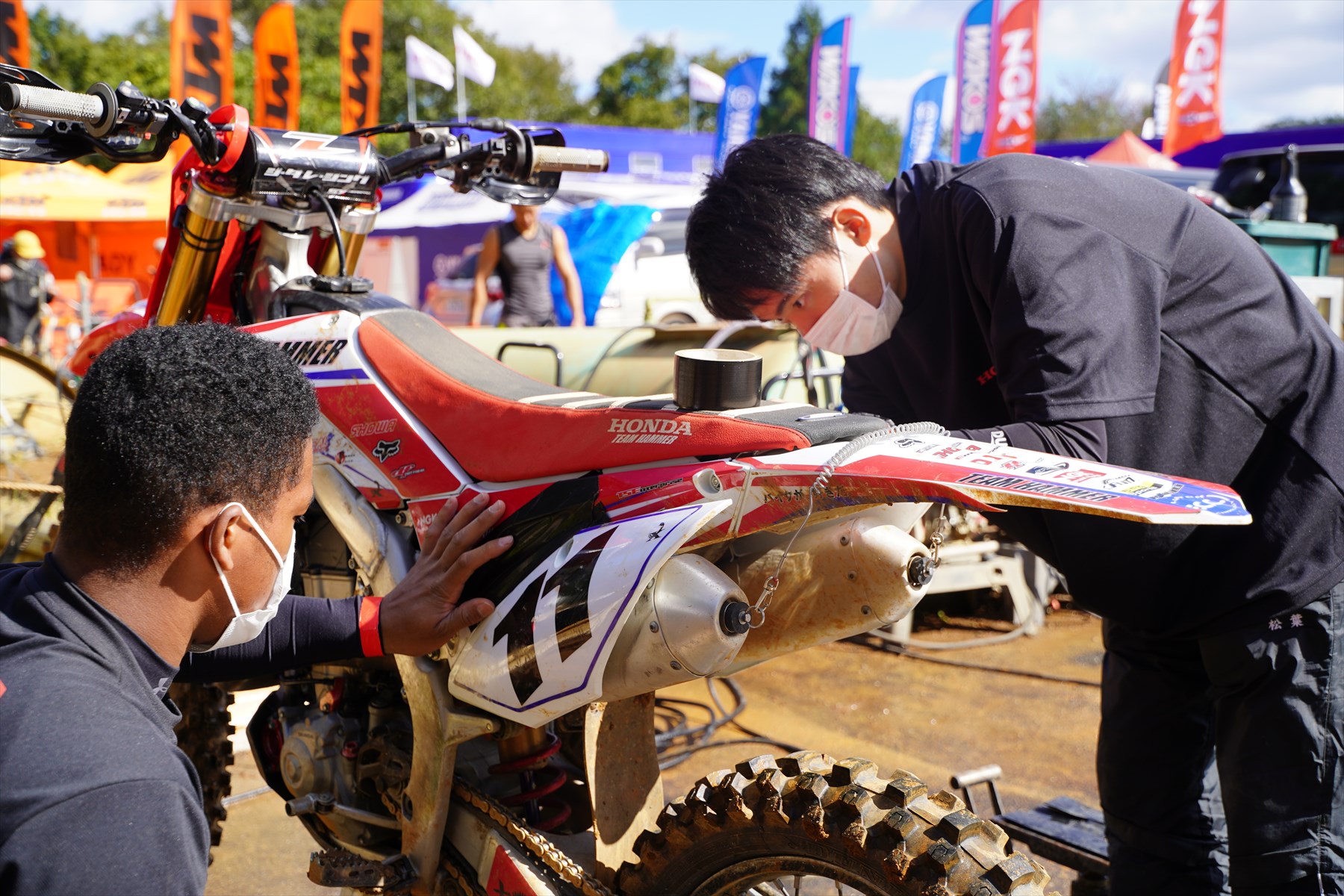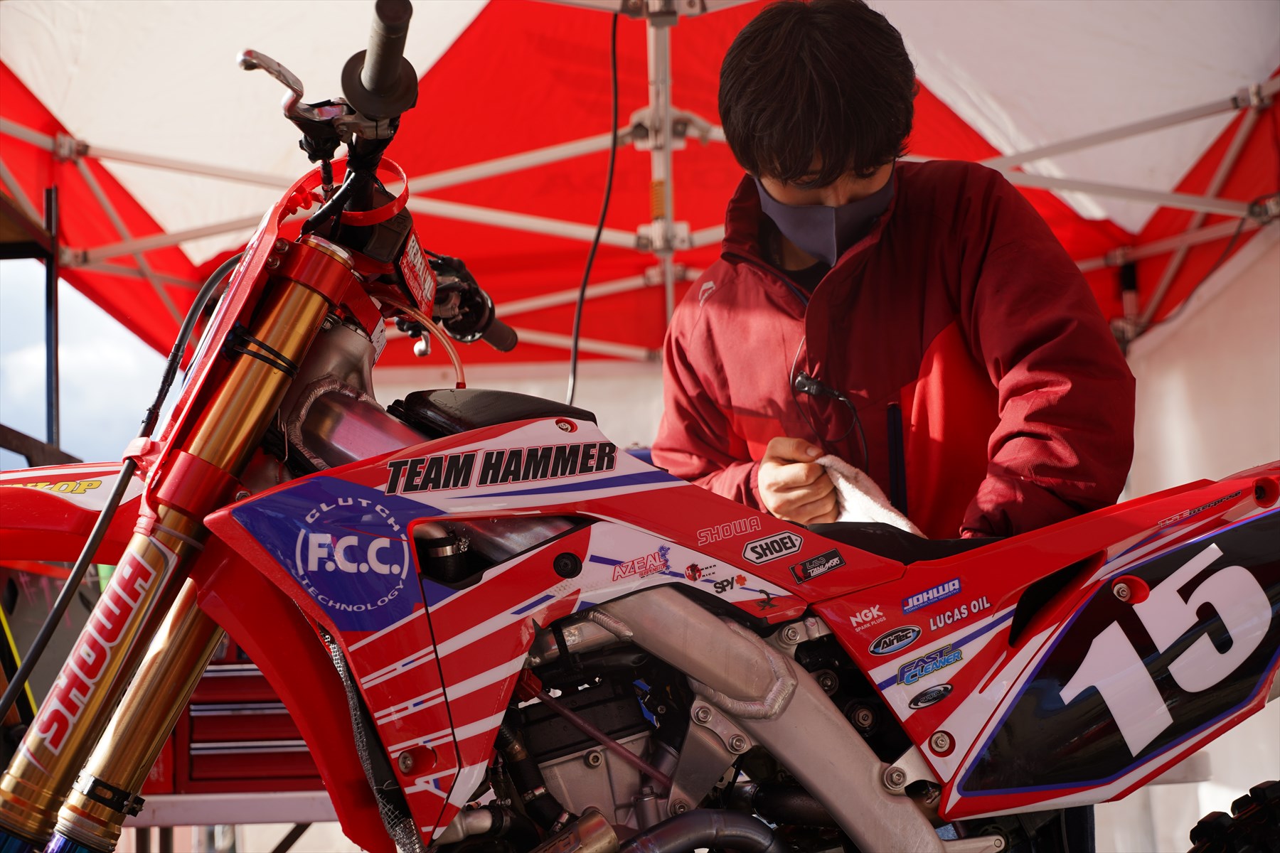 - 初日は緊張からか表情もかたく、作業する時間も短かった様子でしたが、TEAM HAMMERのメカニックの方からの丁寧な指導のおかげで徐々にフットワークが軽くなる2人。
