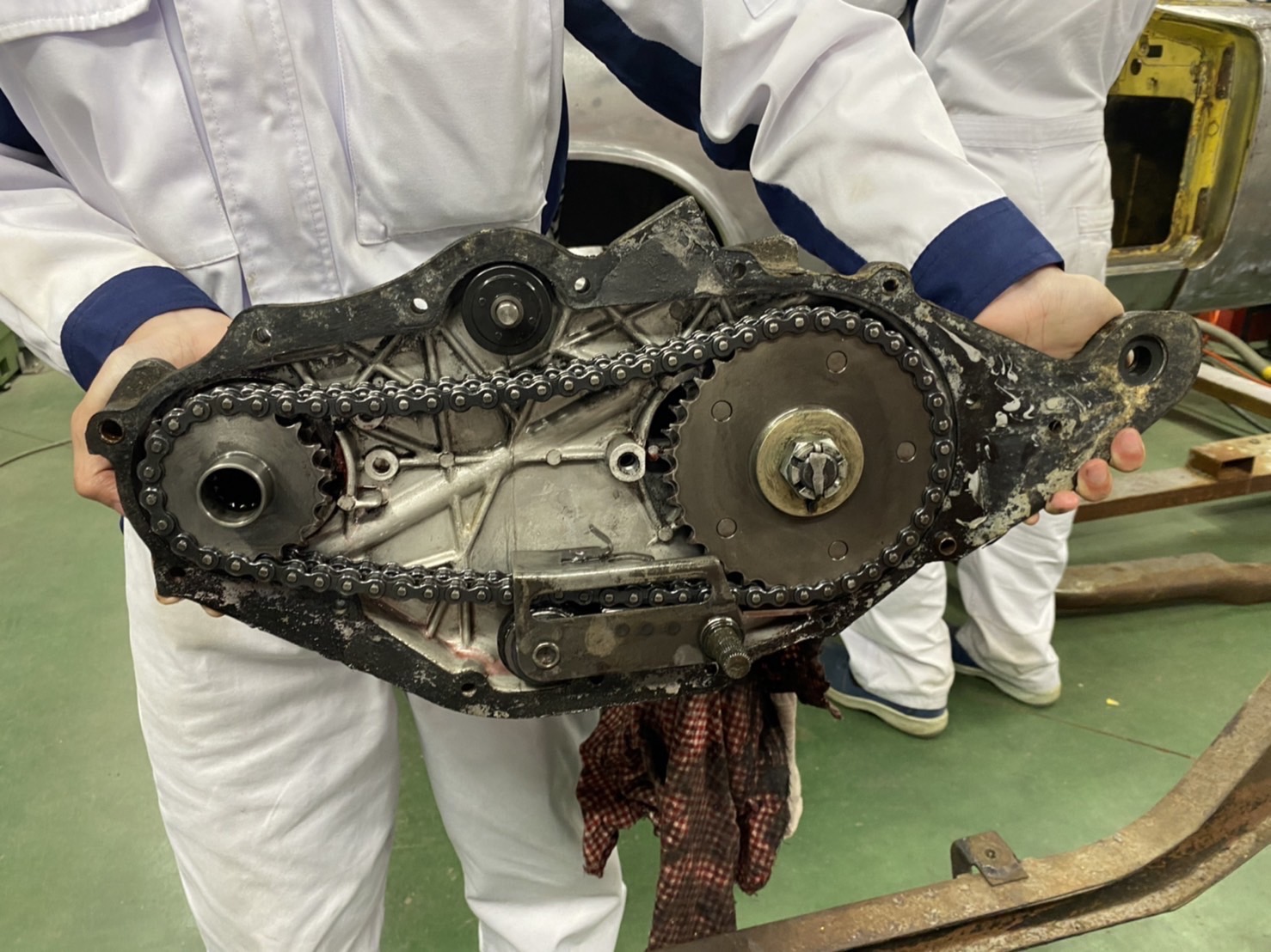 ここからは分解確認用として使っていたシングルチェーンタイプのチェーンケースを洗浄・研磨し、新品のチェーンとケースが当たる所を加工して組み立てました!!かなりピカピカになったでしょ‼(*^^*)