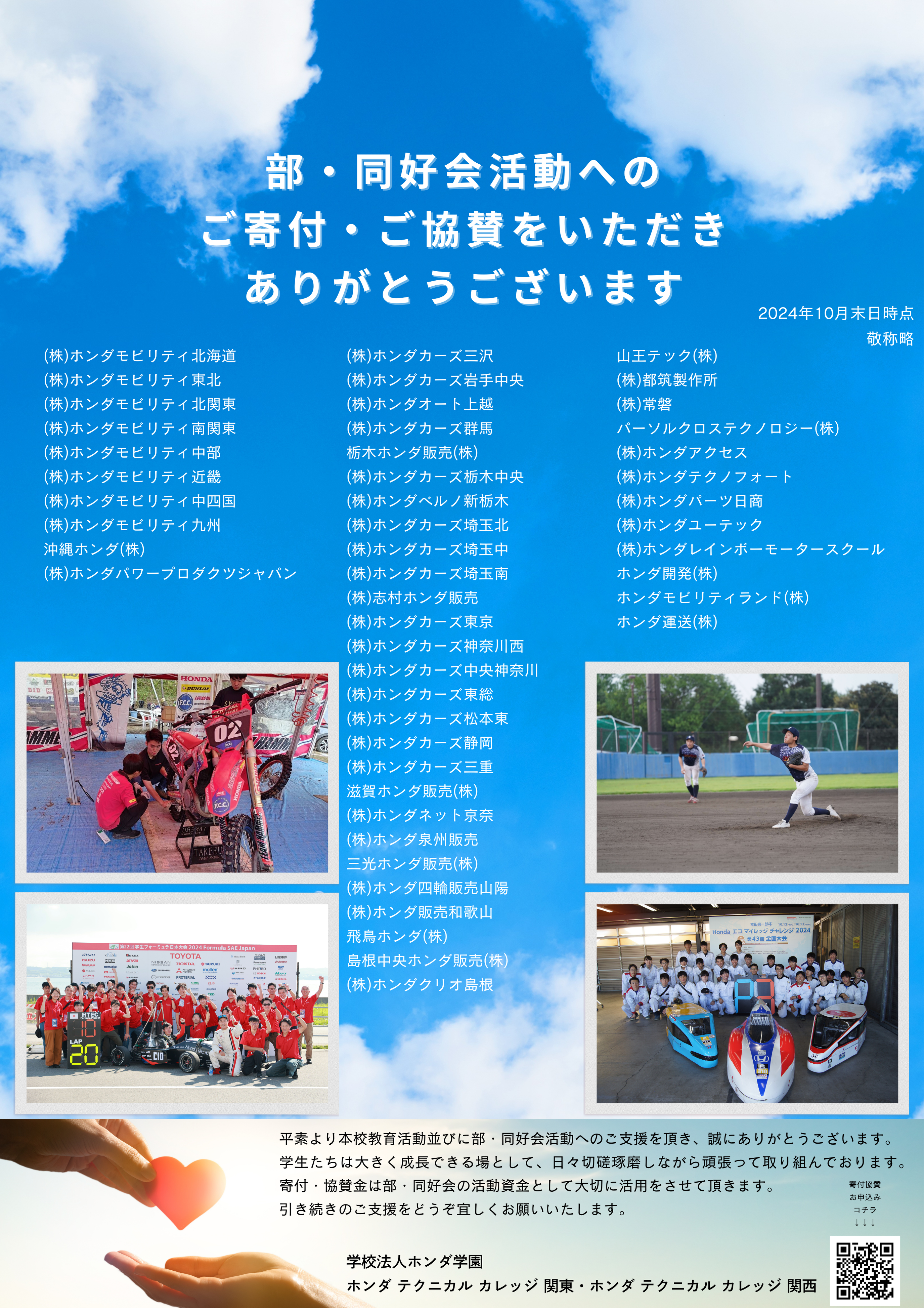 【賛助会企業様】部・同好会活動への寄付・協賛金のお願いについて 2024.10.30 2024年8月に賛助会企業様向けにご案内差し上げた資料となります。 ご寄付・ご協賛につき、ご検討頂けましたら幸いです。 クラブ活動紹介動画(YouTubeチャンネル) 【依頼文】部活動及への寄附・協賛金のお願い2024年8月送付 ホンダ学園宛て寄付・協賛金申込書2024
