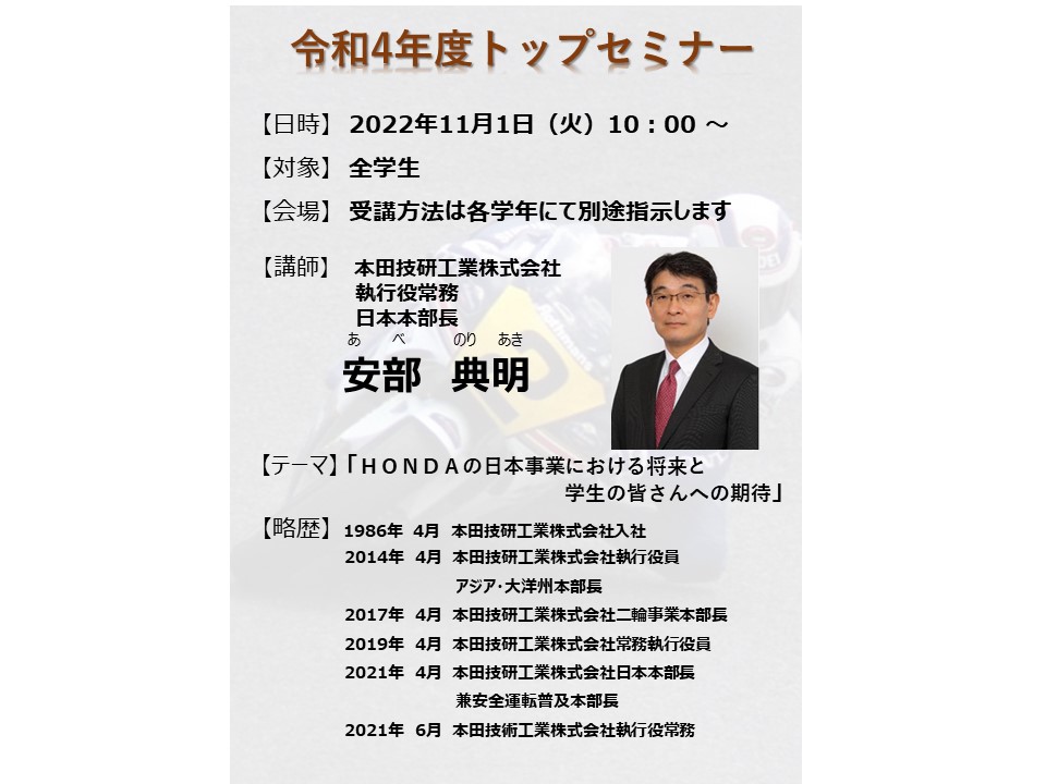 ※TOPセミナー:Honda現役の役員を招き、直接お話を戴くことによって、学生および教職員の視野を拡げ、就学や就職への意識の高揚を図ることを目的に毎年実施