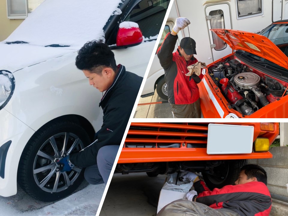 故郷で、つかの間の休息を楽しみつつも、授業で学んだタイヤ交換や、車のメンテナンスを手伝う姿が。