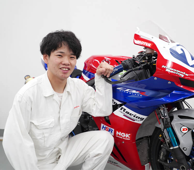 高校時代からバイクにのめり込んでいたため、世界をリードするバイクメーカーであるHondaの学校を選びました。在学中は部活に打ち込み、仲間と一致団結してレースに出場したことが良い思い出に。授業では基礎、部活では応用を学べる最高の環境でした。この会社に入社したきっかけは、担任の先生に「バイクが好きならホンダモーターサイクルジャパンがいいよ」とすすめられたこと。日本市場において、Hondaのバイクにはだいたい当社が関わっています。だからこそ日々たくさんの学びがあり、改めてバイクの楽しさや魅力を感じています。社会に出ると、知識はもちろん、人間関係やモノの考え方で人との差がうまれるもの。ホンダ学園では素晴らしい仲間とさまざまな考え方を学び、楽しい学園生活を過ごせたことが今に役立っています。