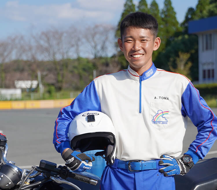 幼い頃からHondaに関わる仕事をすると決めていました。Hondaの第一線で活躍されてきた先生方がいるホンダ学園なら、夢を実現にできると思い進学を決意。入学後は鈴鹿8耐レースでピットワークなど、想像以上の実践現場を経験できたこと、達成感は今でも脳裏に焼き付いています。校内技術コンクールで、仲間と力を合わせ優勝できたことも忘れられません。今は幼い頃の夢をかなえ、企業様向けの運転講習やバイクのインストラクターとして、安全運転の普及に努めております。少しでも気になったら、直接オープンキャンパスへの参加をお勧めします。パンフレットや動画では感じることのできない印象や雰囲気がわかると思います。