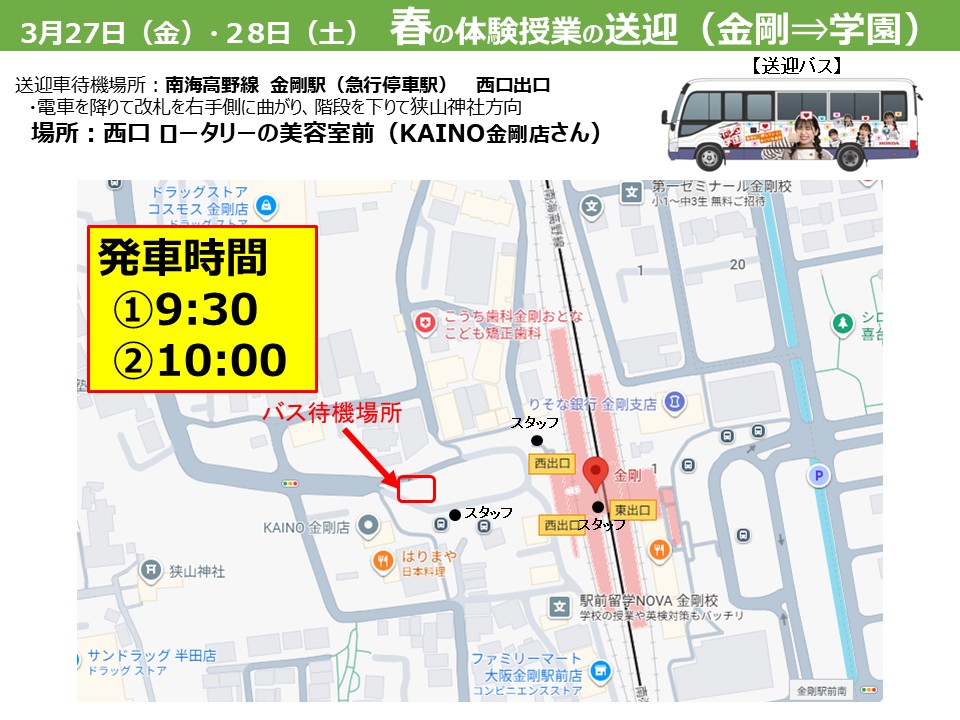 - 最寄駅の南海高野線:金剛駅より送迎車をご用意。駅改札付近に本校のスタッフが待機しております。