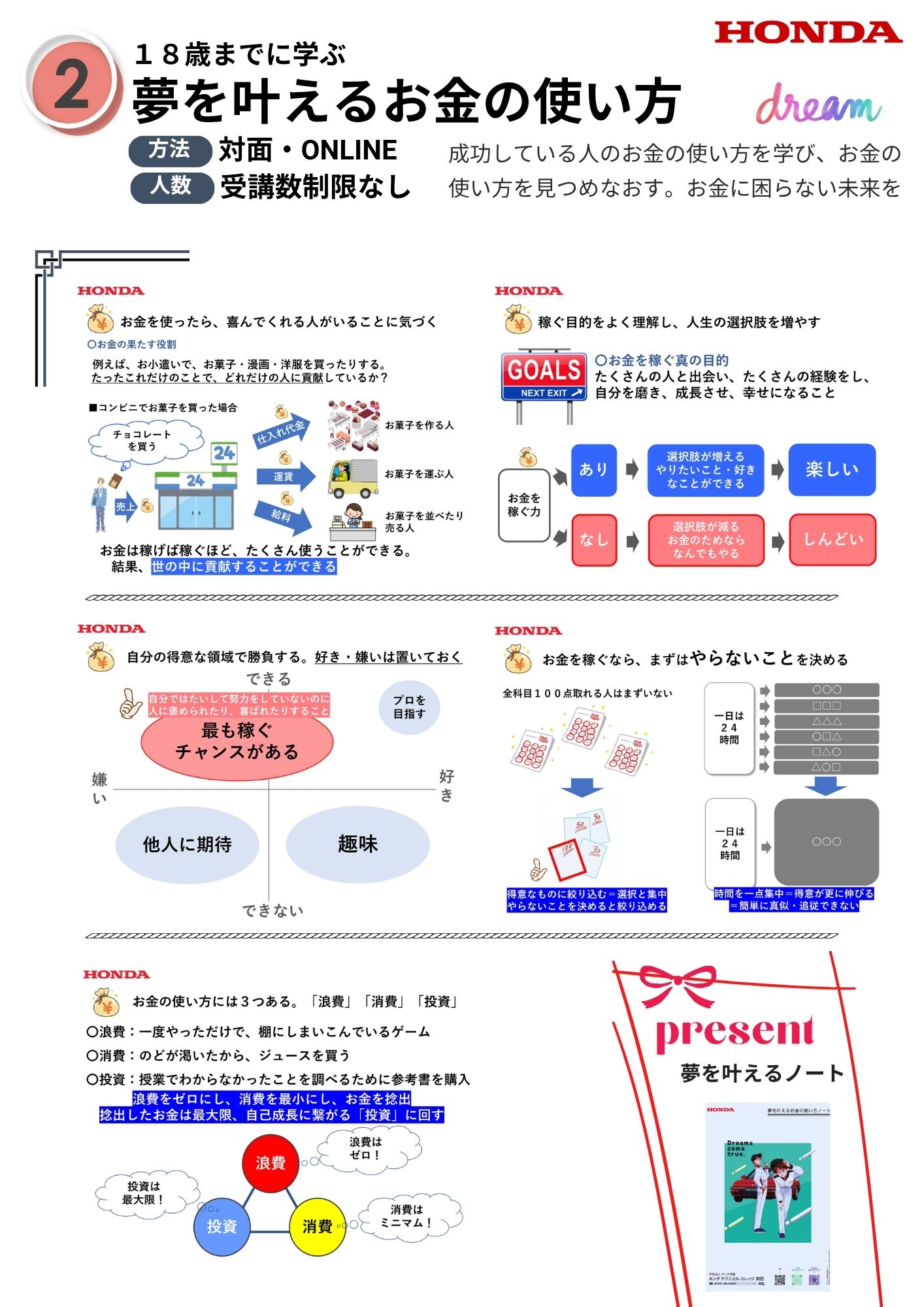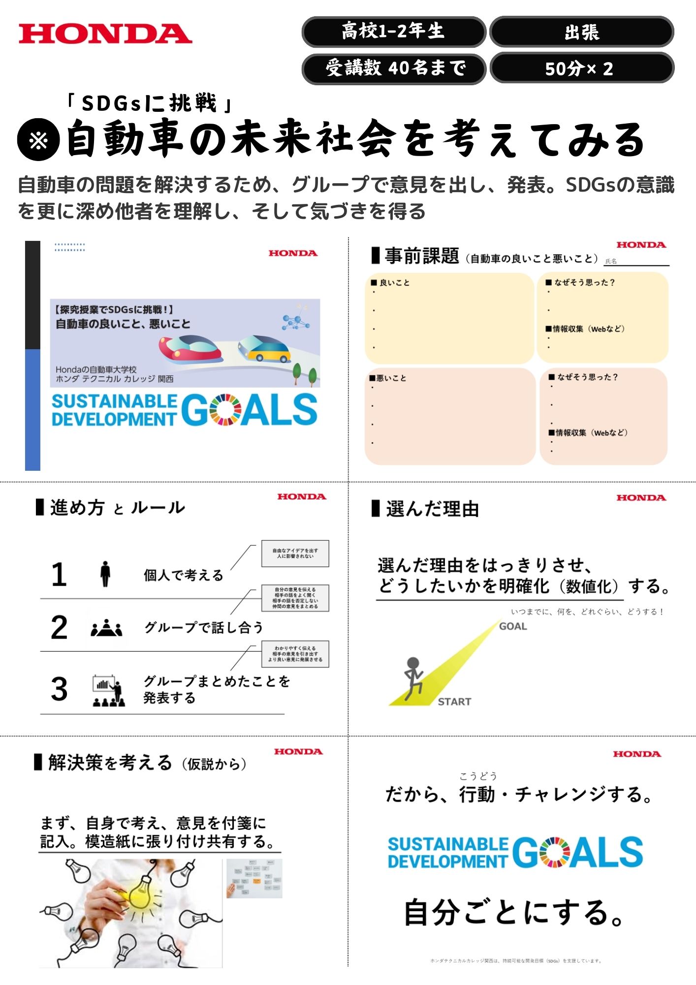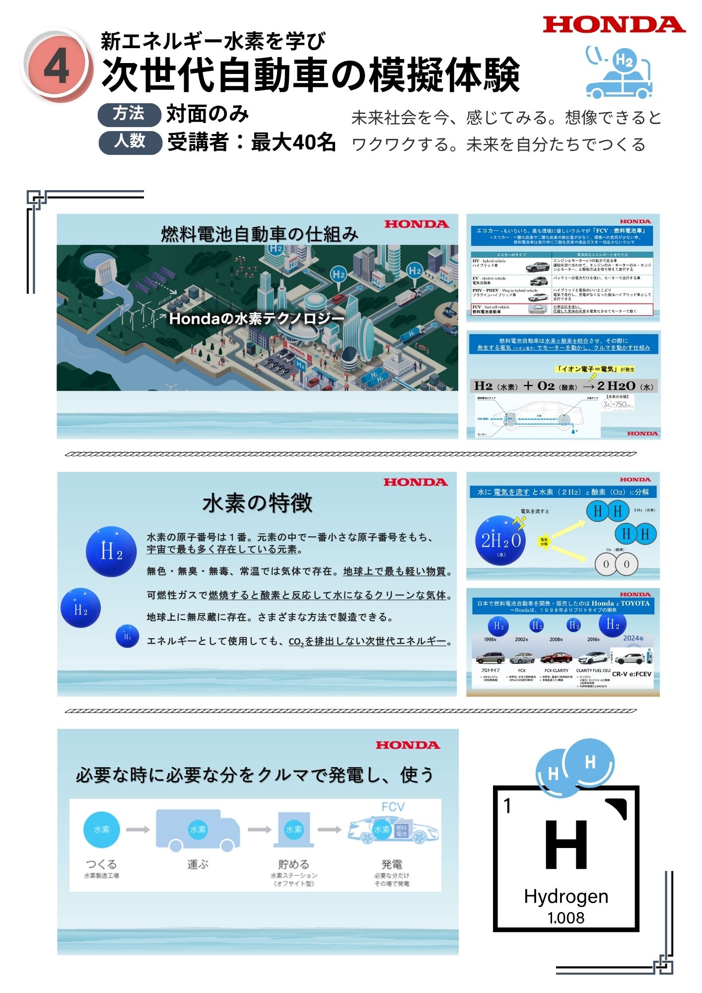 Hondaの自動車大学校では、西日本の高等学校向けに4つの出前授業(無料)をご用意しております。