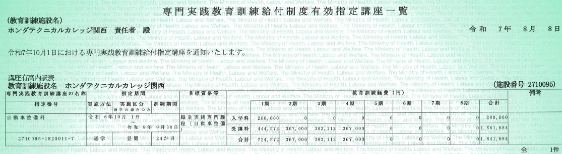 厚生労働省より自動車整備科(2年課程)が、教育訓練給付金の対象となる「専門実践教育給付金指定講座」に認定されました。