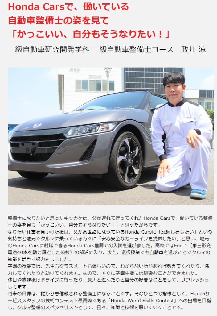 本校に入学する入試方法も様々ですが、そのひとつの入試方法「Honda Cars推薦」を選び、入学してきた在校生をご紹介します。「Honda Cars 推薦」制度には、自動車整備士になるための手厚いサポートがございます。ぜひ、「Honda Cars推薦」制度を選んだ学生の声もご参考にしてみて下さい。
