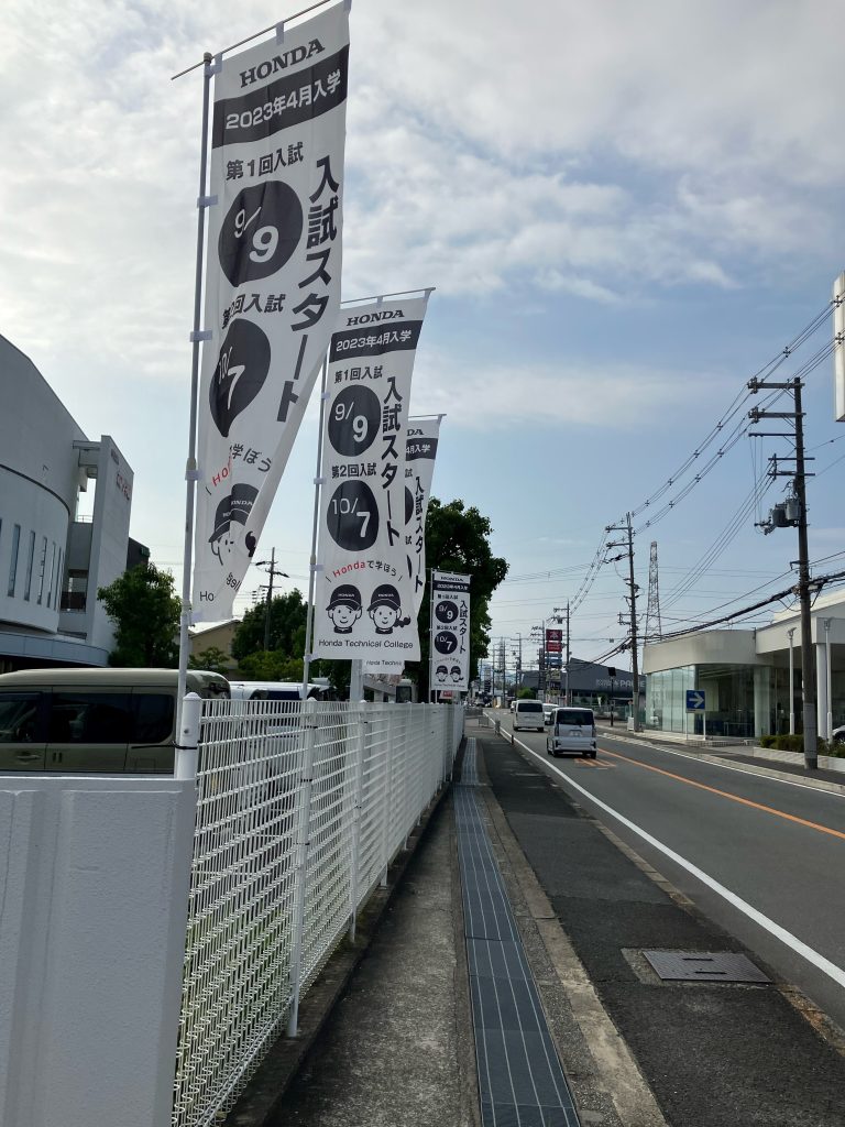 いよいよ2023年4月入学生用の入試が9月より始まります。昨日より、ホンダテクニカルカレッジ関西の正門側フェンスに設置してある、のぼりも入試の案内に付け替えました。