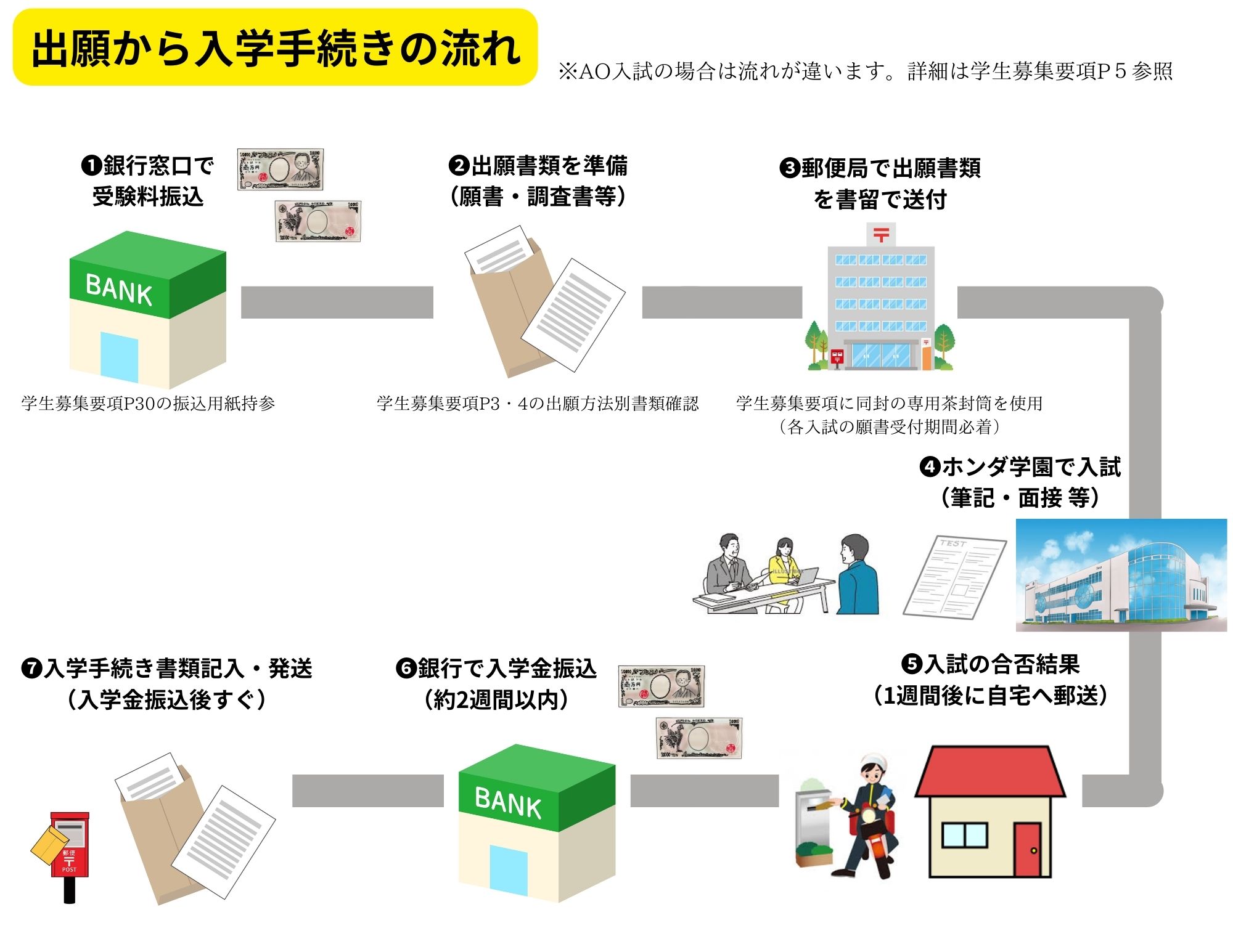 入試に必要な書類は、出願方法ごとに書類が違ったり、選考日(受験日)により出願締切日(出願書類がホンダ学園に到着していないといけない日)も違います。出願書類は早めにご準備いただき、余裕を持って本校へ送付ください。