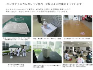 【報告】新型コロナウイルスの感染予防対策への取り組み 2020.06.04 6月1日(月)より、新型コロナウイルスの感染予防対策を徹底し、学校授業を再開しております。 本校から感染者を出さないよう、教職員・学生全員での運用徹底とご来校者の皆様にも感染予防対策へのご協力をお願いしております。 安心して、登校ができるように。授業ができるように。みんないつの日か前の日常に戻れるように。 下記の写真をクリックするとPDFファイルが立ち上がり、拡大して詳細を確認できます。