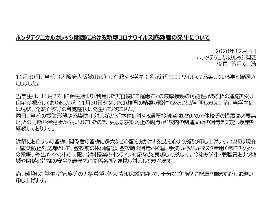 尚、当学生には現状、発熱や咳等の自覚症状は発生しておりません。同日、当校の授業形態や感染防止対応策から「本件に対する濃厚接触者はいないので休校等の措置は必要無い」との判断が保健所から示されましたので、更なる感染防止の観点から校内の関連箇所の消毒を実施し授業を継続しております。