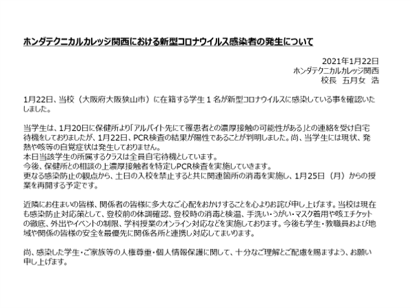 当学生は、1月20日に保健所より「アルバイト先にて罹患者との濃厚接触の可能性がある」との連絡を受け自宅待機をしておりましたが、1月22日にPCR検査の結果が陽性であることが判明しました。