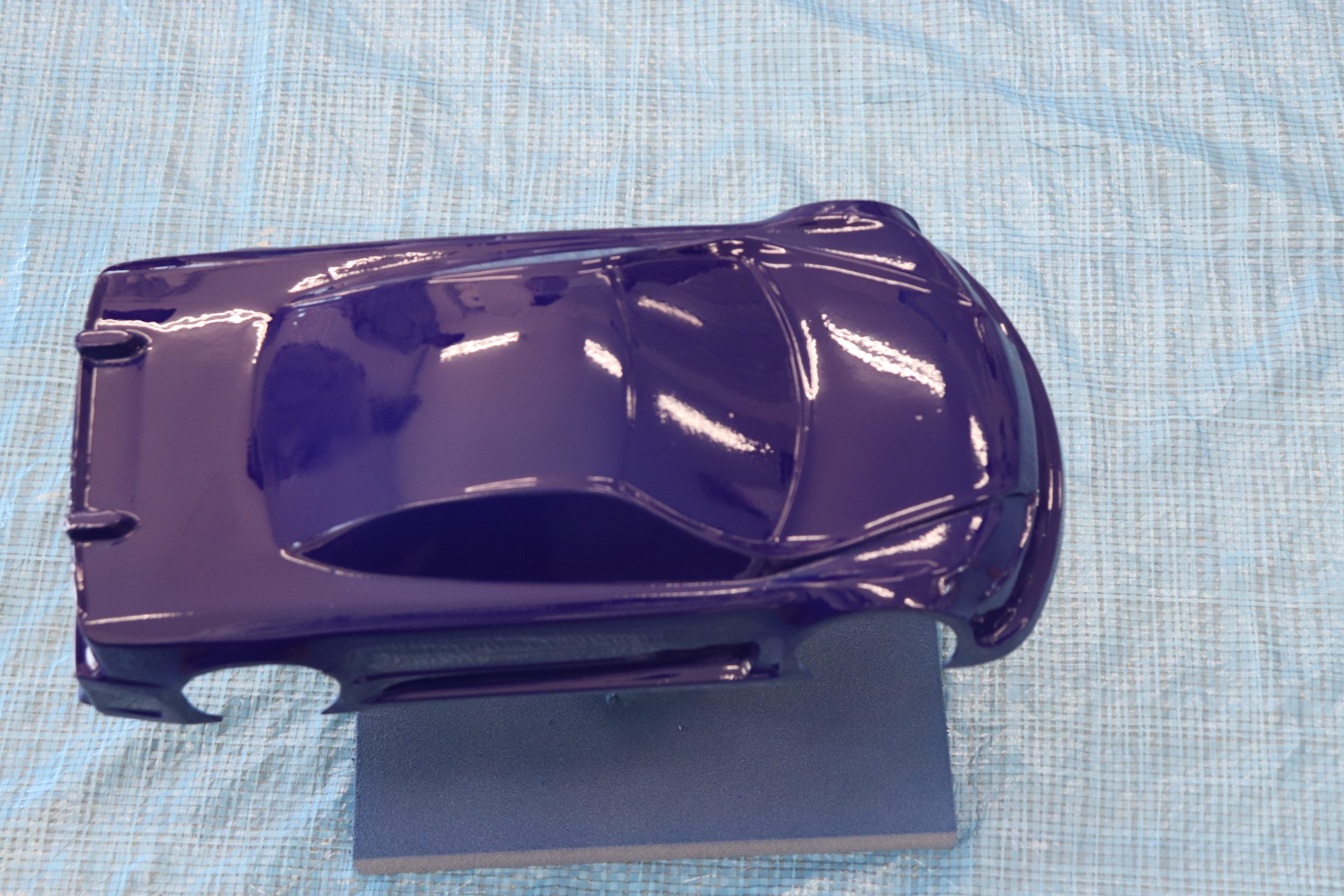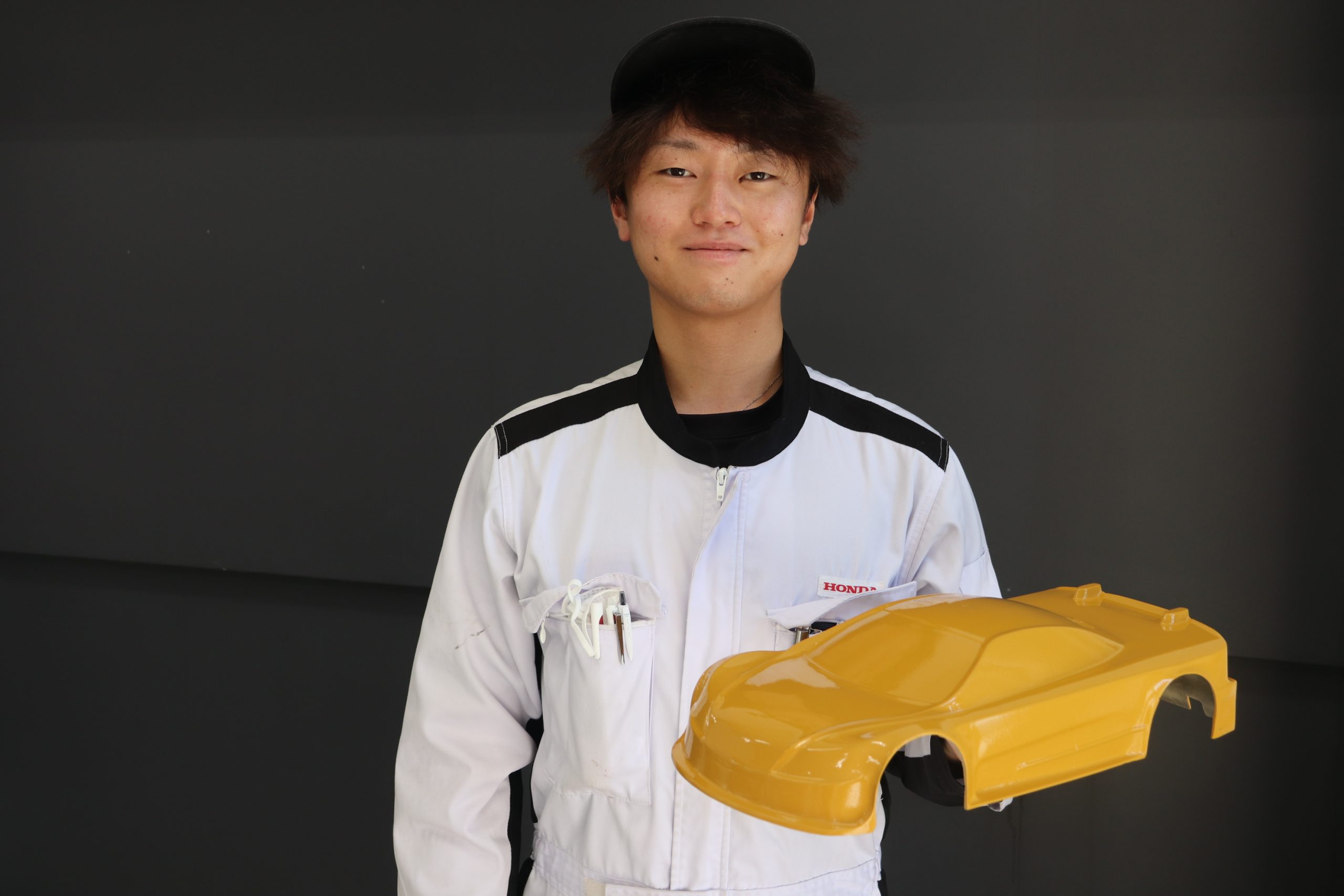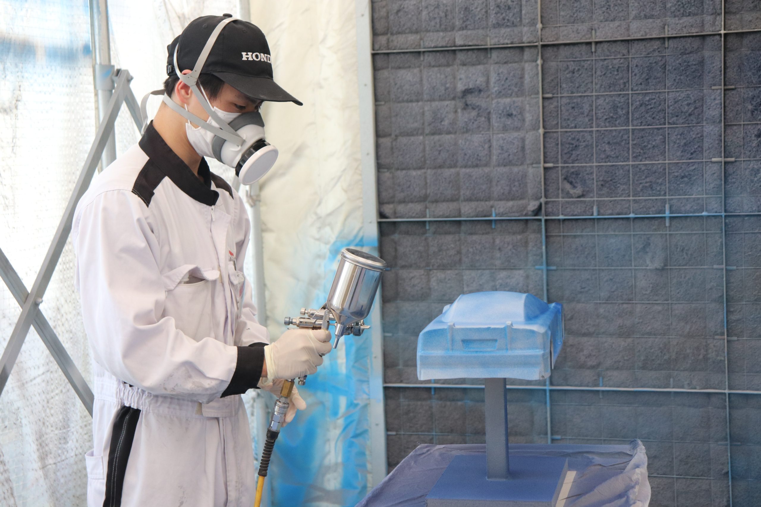 繊維にも種類があり、特にカーボンを使うものが強度が高く、F1などのレース車両に使われてます。また、学園にある教材車:NSXにもこのカーボンで作られているパーツがたくさんあります。今回はガラス繊維を使って、50cmほどの大きさの車の外装を3日間かけて作りました。