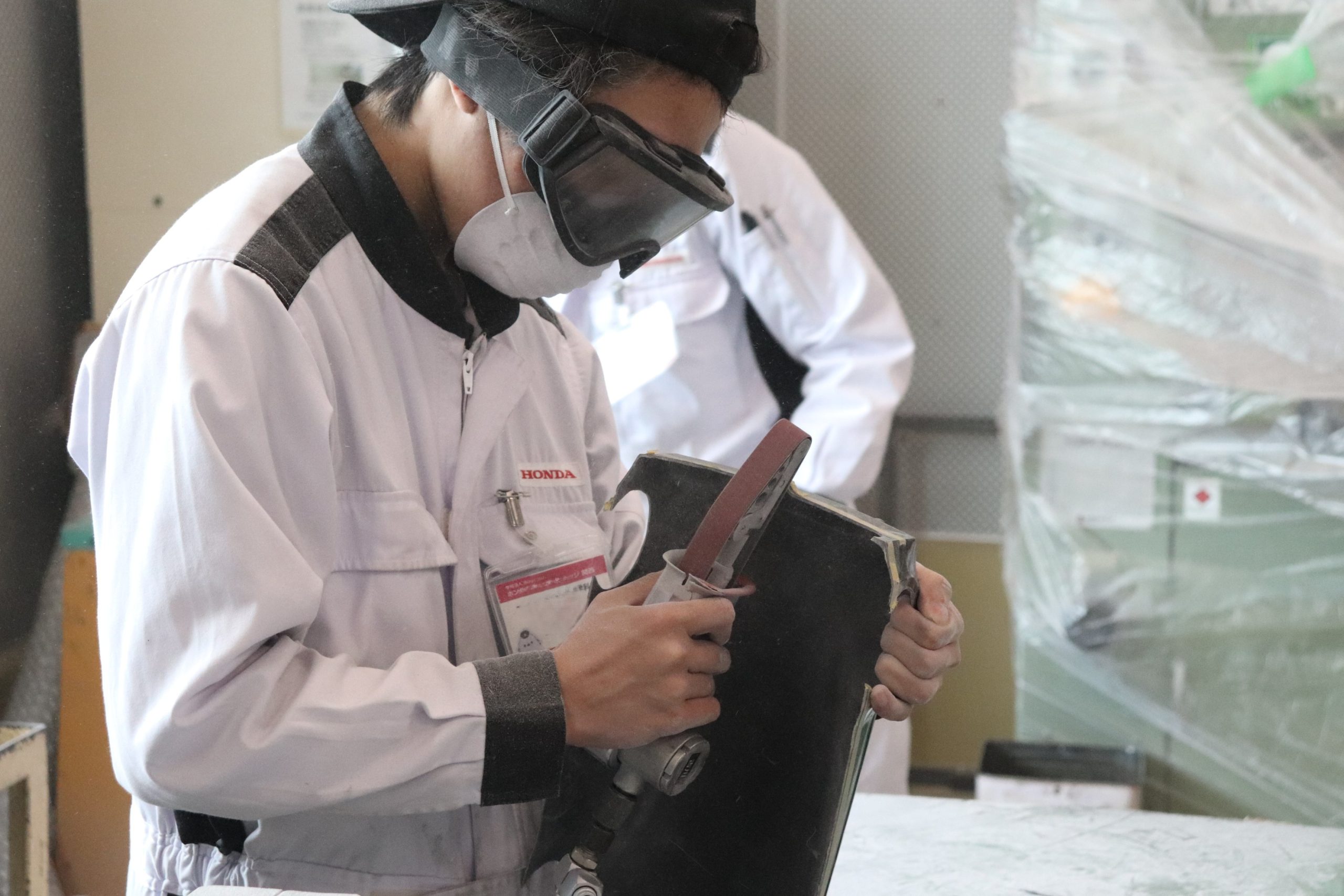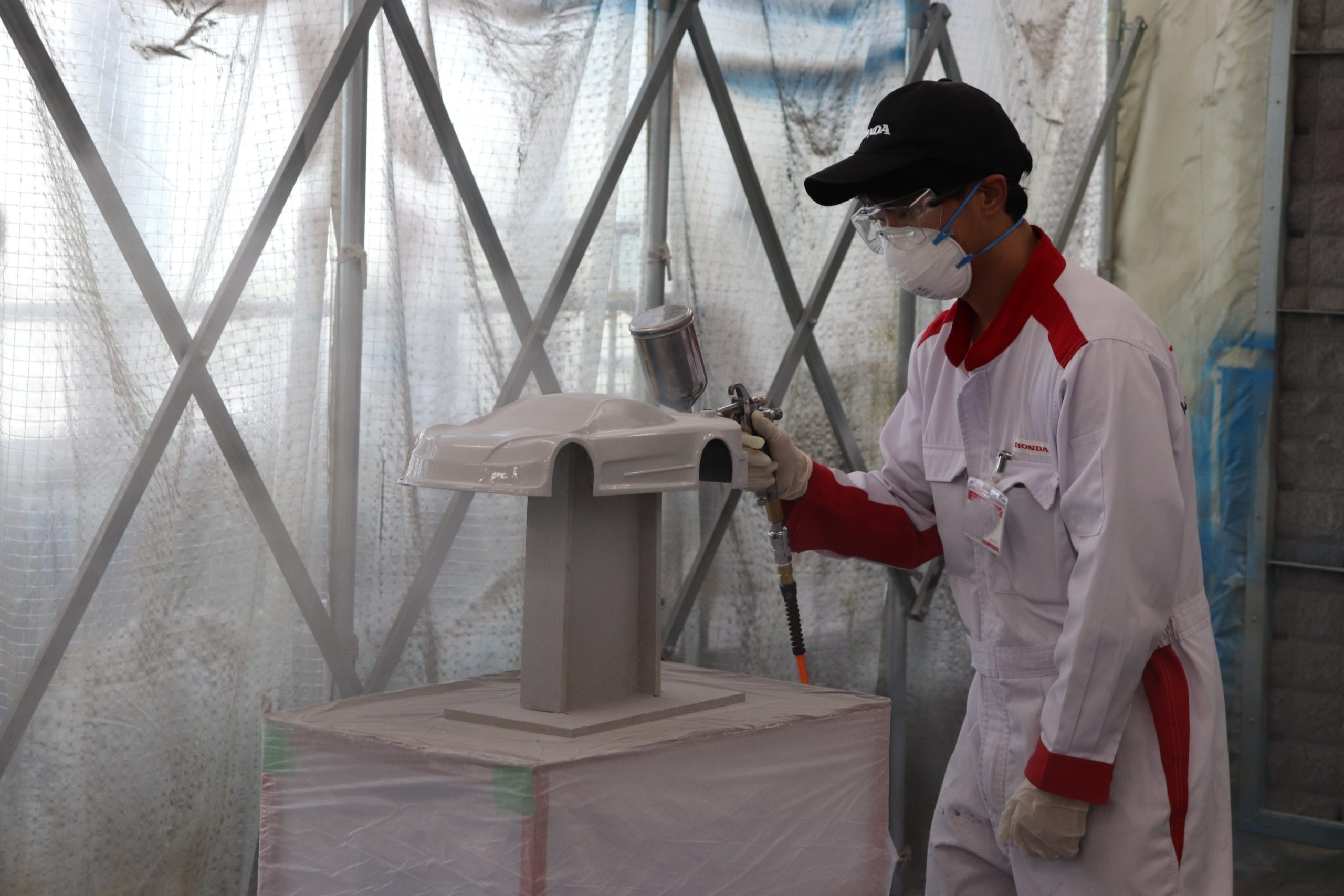 繊維にも種類があり、特にカーボンを使うものが強度が高く、F1などのレース車両にも使われています。また、学園にある教材車のNSXにもこのカーボンで作られているパーツがあります。今回はガラス繊維を使って、50cmほどの大きさの車の外装を3日間かけて作りました。