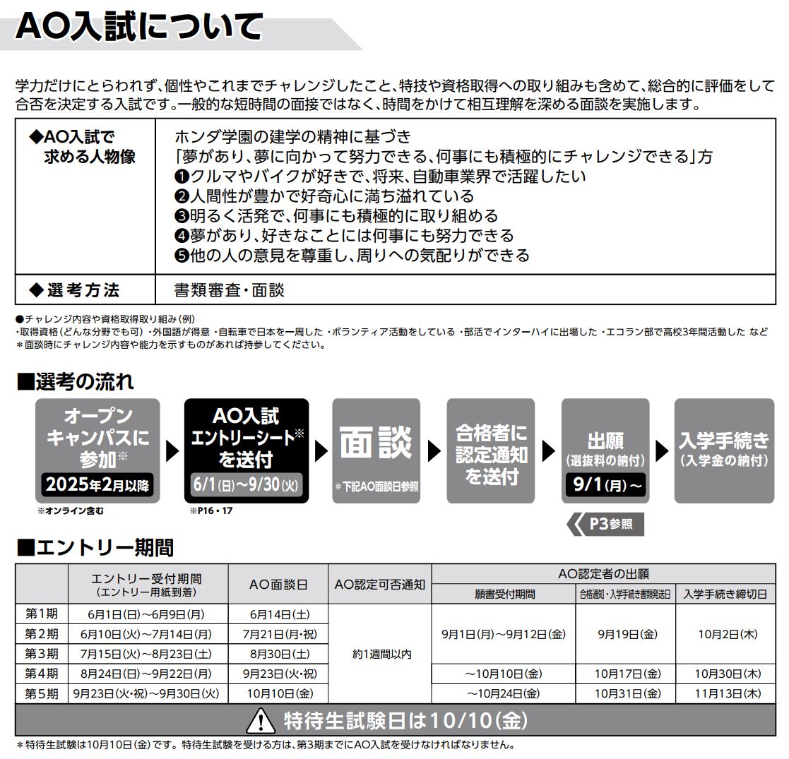 2026年4月入学生を対象とした、いち早くホンダ学園の入試にチャレンジできる「AO入試」。6月1日(日)より、AO入試のエントリーが始まります。