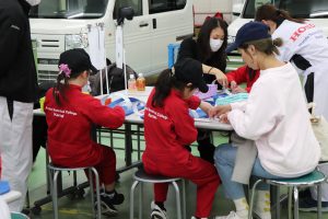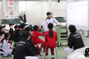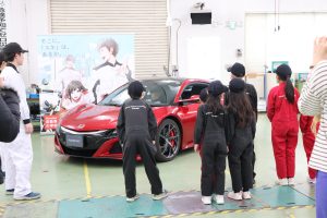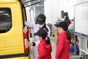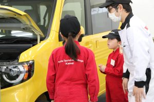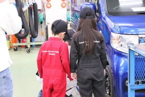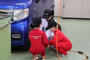 お子様がユニフォームに着替え、クルマの整備をしている姿を見て、保護者の方はいつも笑顔いっぱいです。また、先生役をしている学園生、教職員も毎回素晴らしい時間を過ごさせていただいております。