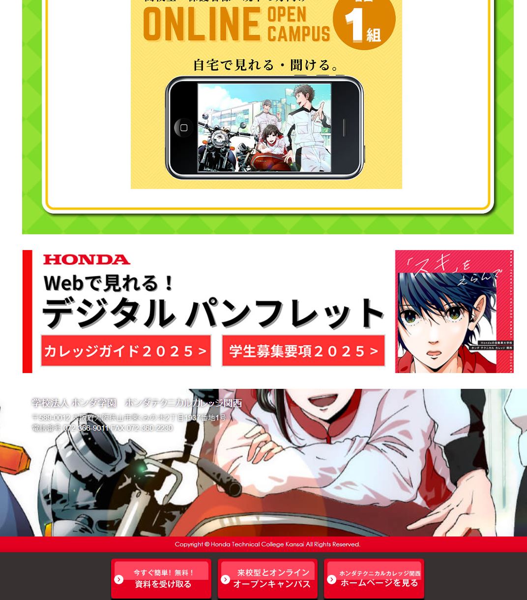 公式のホームページには、入試・オープンキャンパス・就職・資格・学科・奨学金・アクセス等、さまざまな情報があり、また、訪れる方によって知りたい情報、目的が違います。本校は、まずは3分でホンダテクニカルカレッジ関西がわかるようにLPをご用意しております。更に詳細情報が知りたい方はLPから【資料請求・オープンキャンパス予約・ホームページ】へ簡単にアクションができるようになっております。