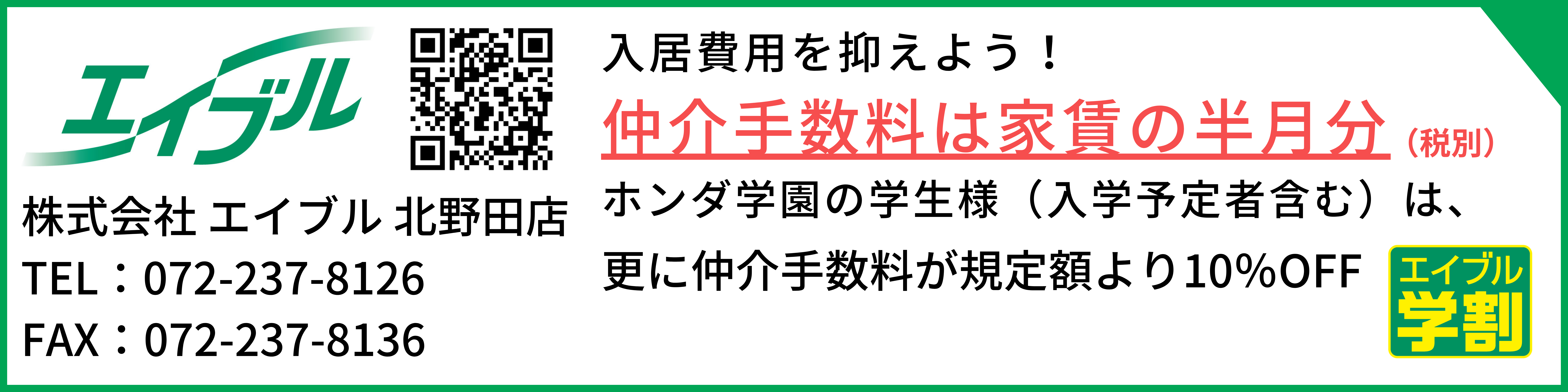 ホンダ学園へ進学を検討されている方で、一人暮らしを検討されている方へ良いお知らせです。本校の最寄り駅(南海高野線:金剛駅)から急行で一駅の北野田駅にある「株式会社 エイブル 北野田店」様が学園生だけへの特典をつけて不動産情報を提供していただけることになりました。アパートやマンションをお探しの方は、ぜひ、エイブル北野田店もご利用ください!