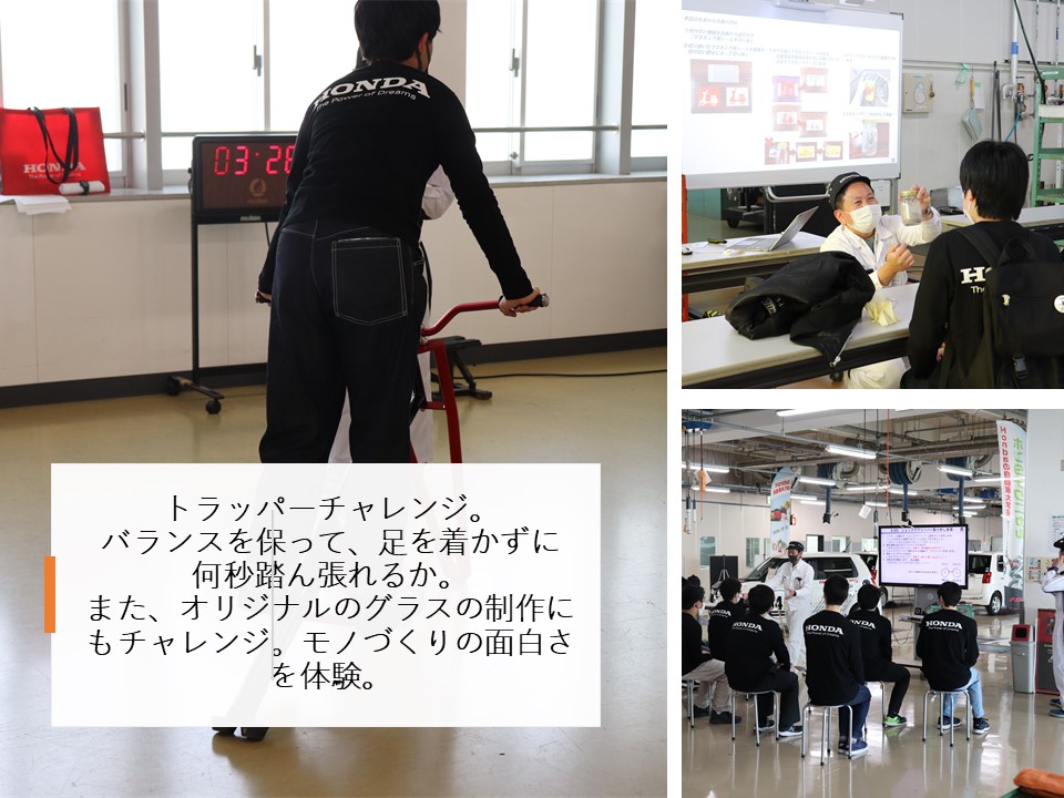 春の体験授業の一日目を無事に終えることができました。実際にクルマやバイクの整備体験、オリジナルのグラスづくりに挑戦したり、先生が制作した電動バイクを運転したり、NSXの同乗試乗やMotoGPのマシンに跨って写真を撮ってみたり、日頃体験することができない一日になったのではないでしょうか。